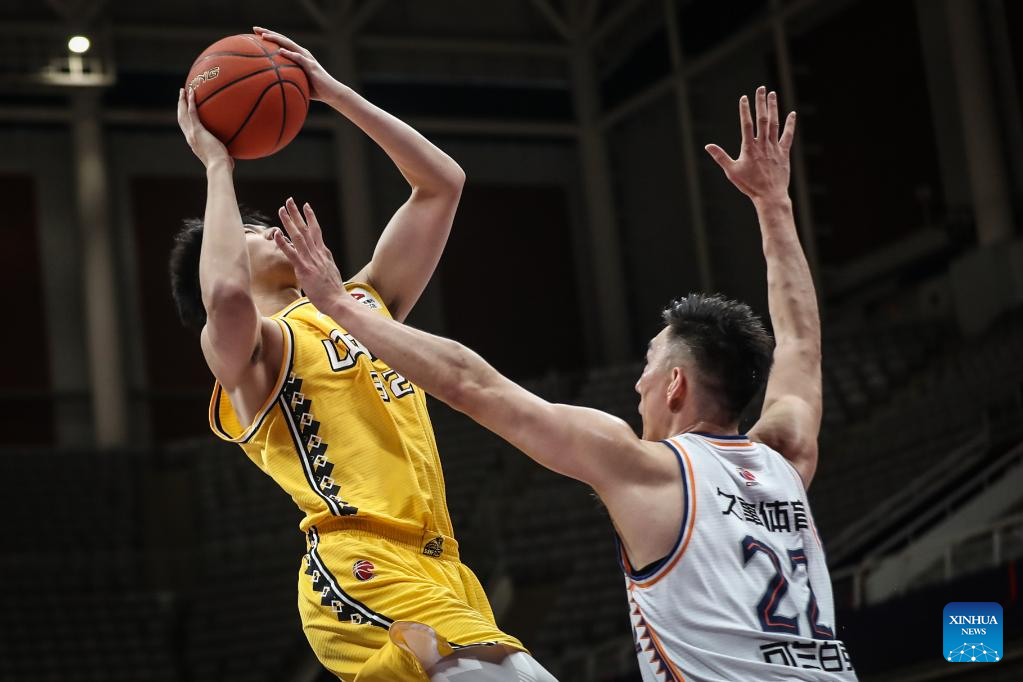 Hu Jinqiu (L) of Zhejiang Lions goes to the basket during the 37th round match between Shanghai Sharks and Zhejiang Lions at the 2021-2022 season of the Chinese Basketball Association (CBA) league in Shenyang of northeast China's Liaoning Province, March 20, 2022. (Xinhua/Pan Yulong)