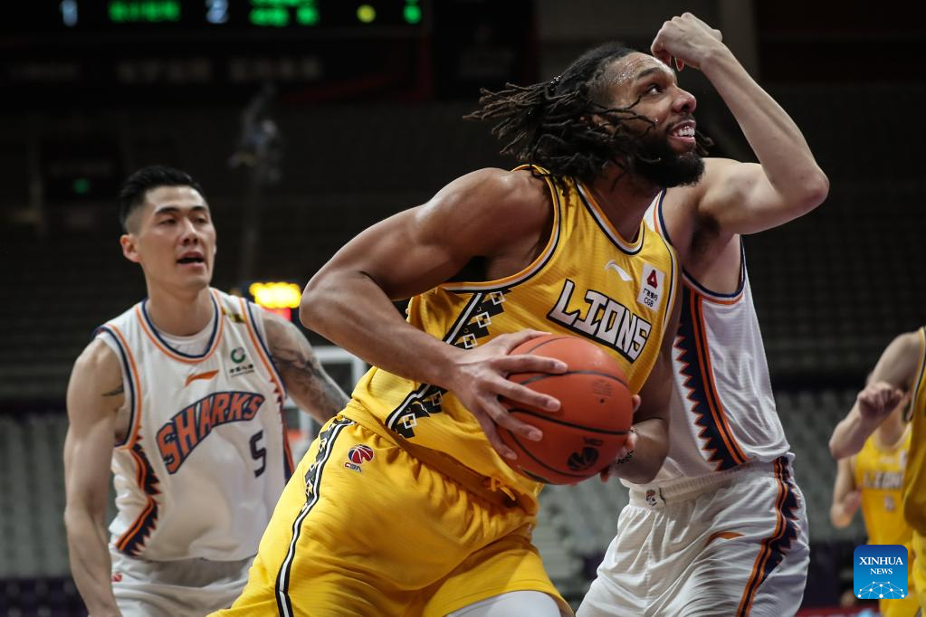 Jahlil Okafor (C) of Zhejiang Lions goes to the basket during the 37th round match between Shanghai Sharks and Zhejiang Lions at the 2021-2022 season of the Chinese Basketball Association (CBA) league in Shenyang of northeast China's Liaoning Province, March 20, 2022. (Xinhua/Pan Yulong)