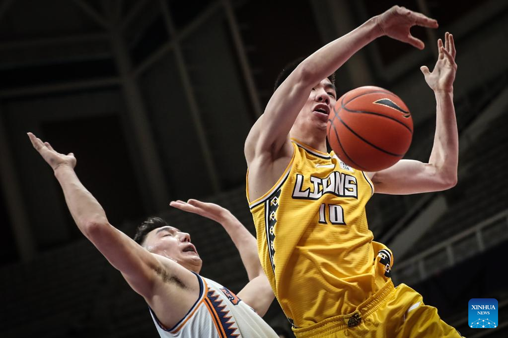 Sun Minghui (L) of Zhejiang Lions accelerates during the 37th round match between Shanghai Sharks and Zhejiang Lions at the 2021-2022 season of the Chinese Basketball Association (CBA) league in Shenyang of northeast China's Liaoning Province, March 20, 2022. (Xinhua/Pan Yulong)