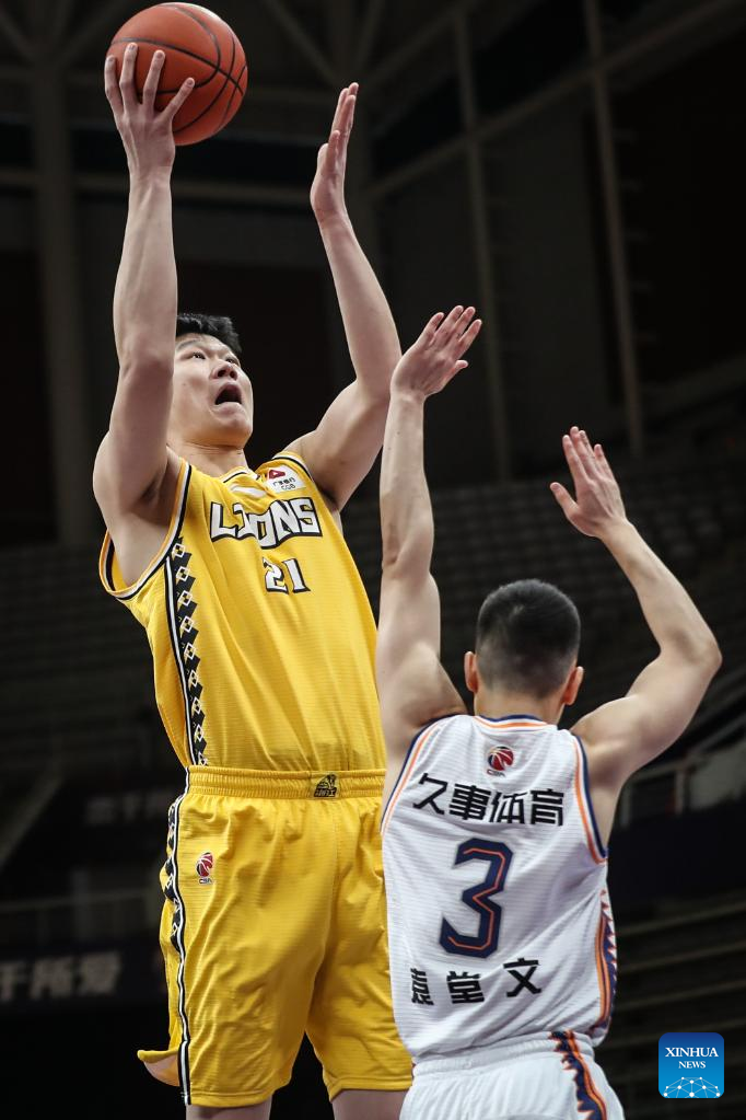 Zhao Jiaren (L) of Zhejiang Lions shoots during the 37th round match between Shanghai Sharks and Zhejiang Lions at the 2021-2022 season of the Chinese Basketball Association (CBA) league in Shenyang of northeast China's Liaoning Province, March 20, 2022. (Xinhua/Pan Yulong)