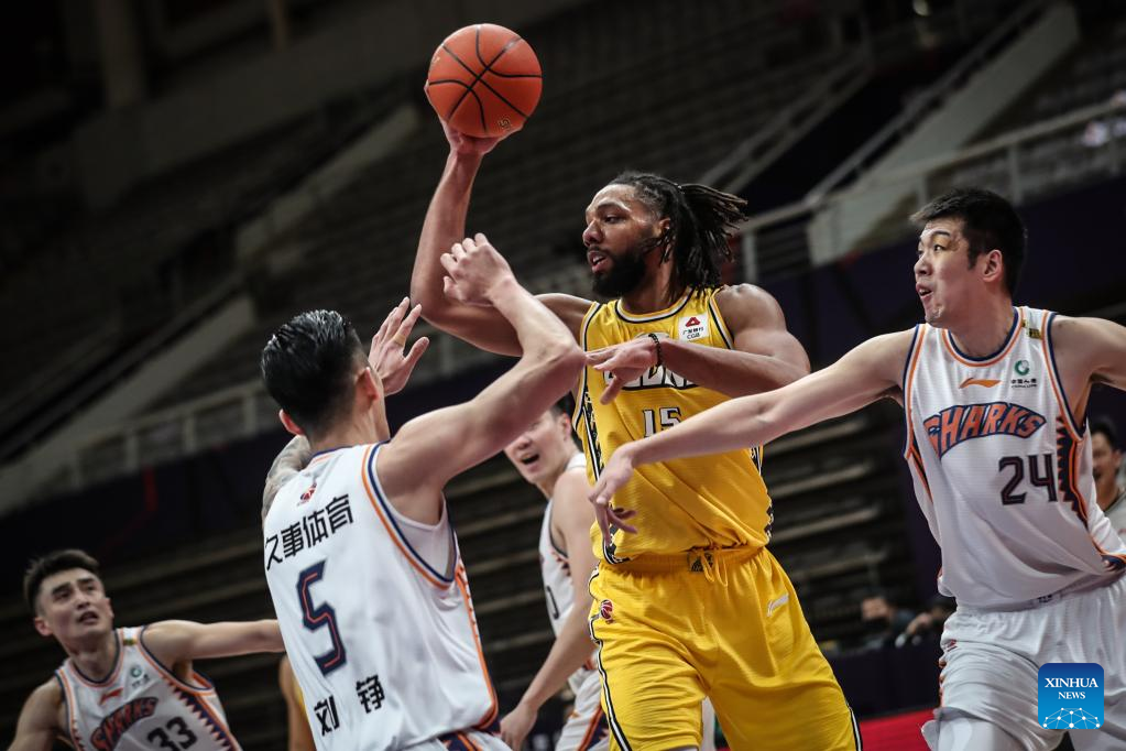Zhu Junlong (R) of Zhejiang Lions vies with Kyranbek Makan of Shanghai Sharks during their 37th round match at the 2021-2022 season of the Chinese Basketball Association (CBA) league in Shenyang of northeast China's Liaoning Province, March 20, 2022. (Xinhua/Pan Yulong)