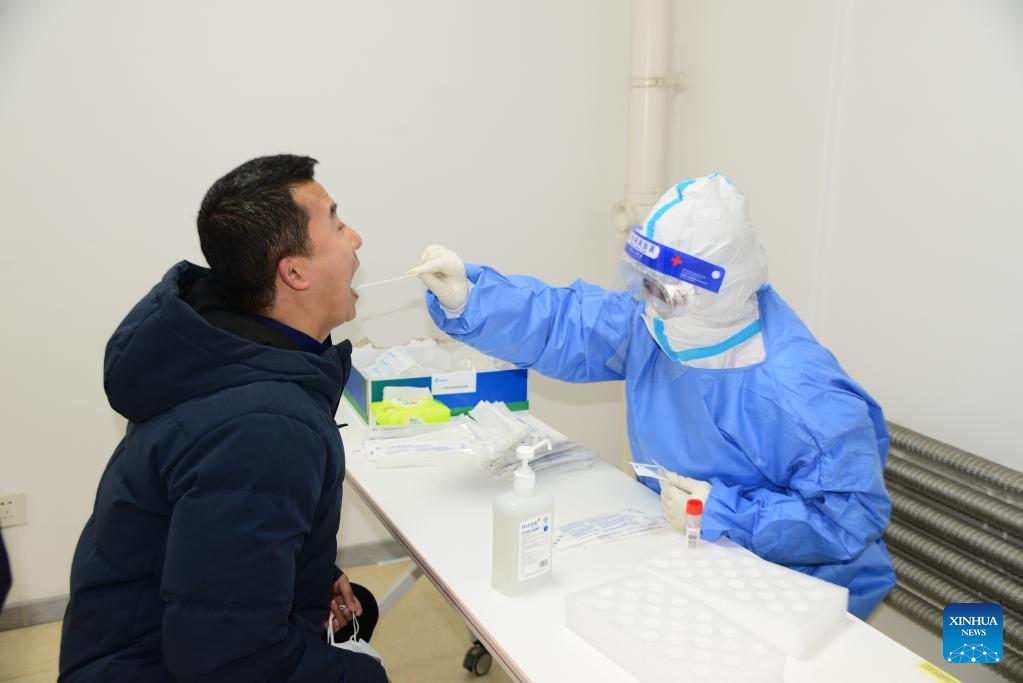 A medical worker takes a swab sample from a man for a nucleic acid test at a testing site in Changchun, northeast China's Jilin Province, March 20, 2022. Changchun rolled out a new round of mass nucleic acid test as a measure to combat the latest COVID-19 resurgence on Saturday. (Xinhua/Zhang Jian)