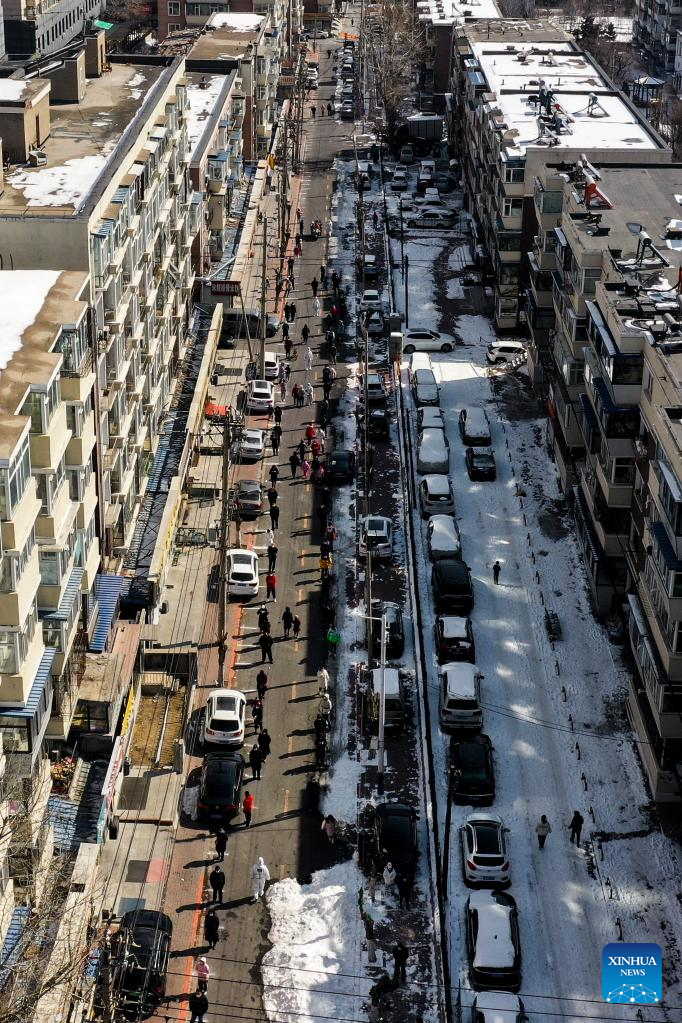 Aerial photo taken on March 20, 2022 shows citizens lining up to take nucleic acid test at a testing site in Changchun, northeast China's Jilin Province. Changchun rolled out a new round of mass nucleic acid test as a measure to combat the latest COVID-19 resurgence on Saturday. (Xinhua)