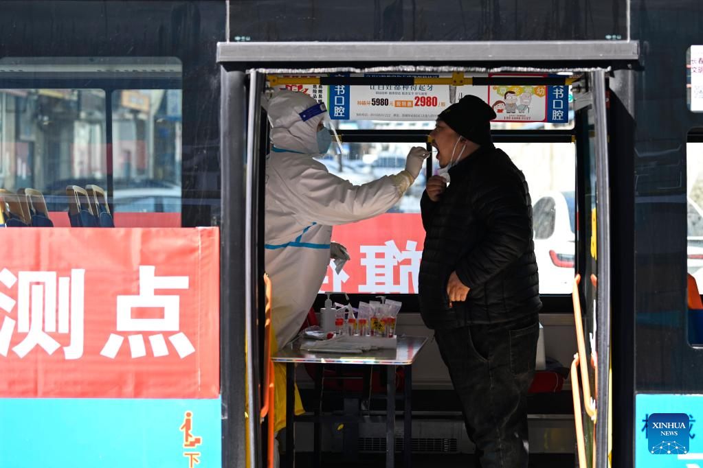 A citizen receives nucleic acid test on a bus used as a temporary testing site in Changchun, northeast China's Jilin Province, March 20, 2022. Changchun rolled out a new round of mass nucleic acid test as a measure to combat the latest COVID-19 resurgence on Saturday. (Xinhua)