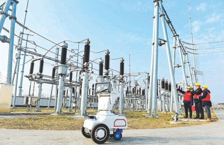 A 5G smart robot and maintenance engineers inspect power supply equipment of the Beijing-Shanghai high-speed railway in Chuzhou, Anhui province, on Jan 17. SONG WEIXING/FOR CHINA DAILY