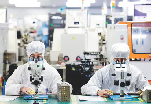 Workers produce chips for export at an electronic enterprise in the Sihong Economic Development Zone in Sihong county, Jiangsu province, on Feb 23. China will pursue an innovation-driven development strategy and strengthen the foundation of the real economy amid the COVID-19 pandemic. XU CHANGLIANG/XINHUA