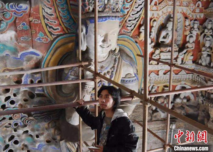Photo shows Shi Yanchun inside the Yungang Grottoes in Datong city, in north China’s Shanxi Province, busying himself restoring a Buddhist statue. (Photo courtesy of the interviewee)