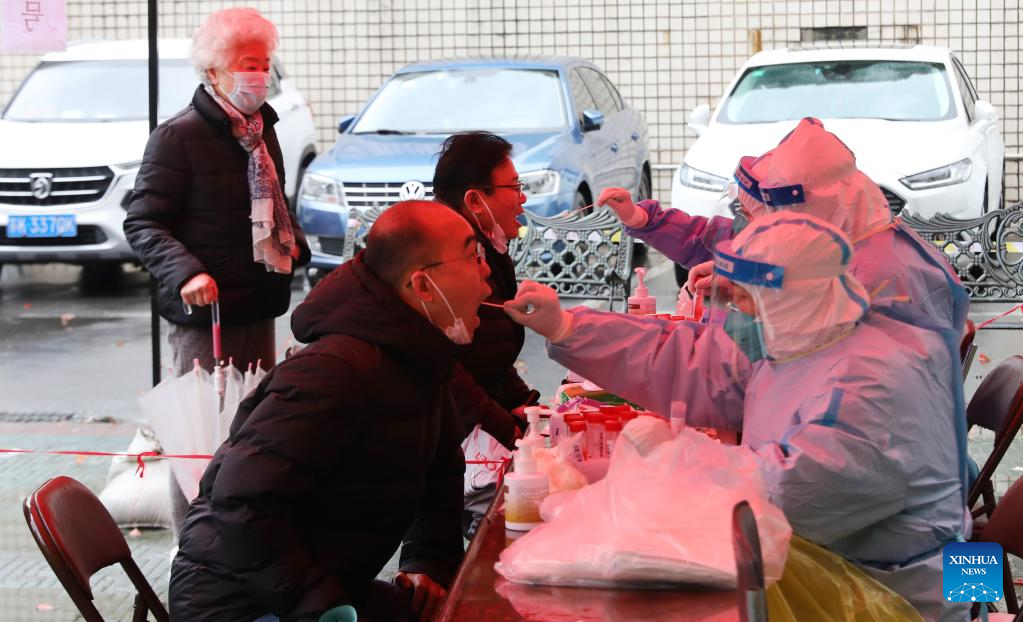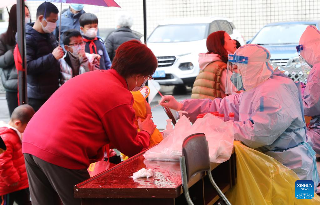 Medical workers take swab samples from residents for nucleic acid test at a residential area in east China's Shanghai, March 21, 2022. (Xinhua/Fang Zhe)