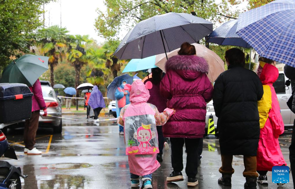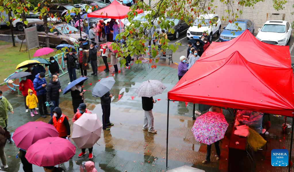 Residents queue to receive nucleic acid tests at a residential area in east China's Shanghai, March 21, 2022. (Xinhua/Fang Zhe)