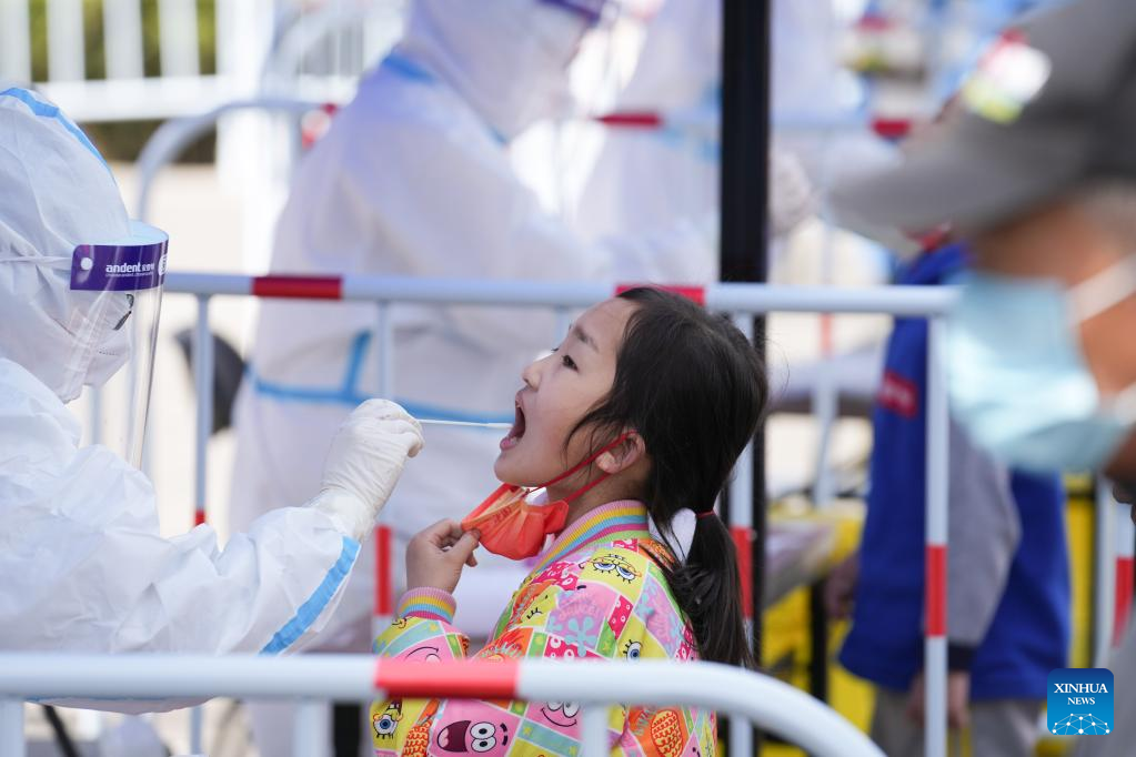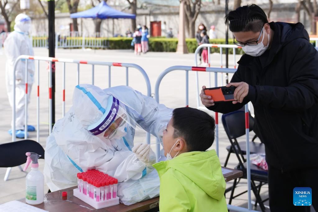 A medical worker collects nucleic acid sample from a kid at a testing site in Dongcheng District, Beijing, capital of China, March 21, 2022. (Xinhua/Ju Huanzong)