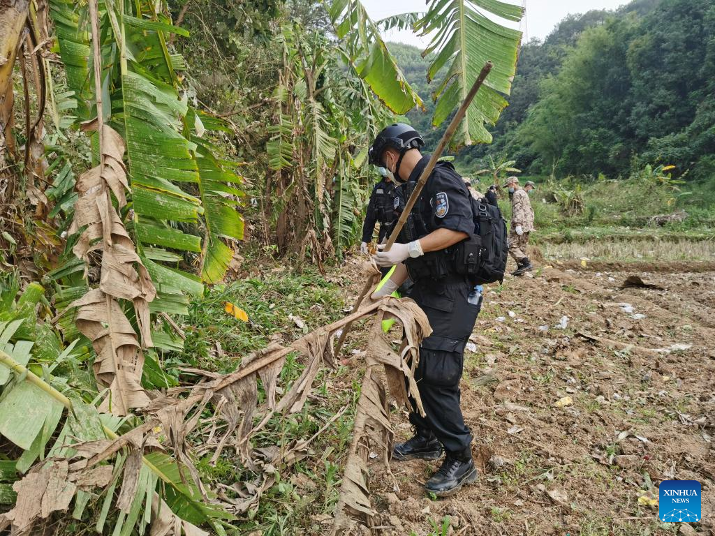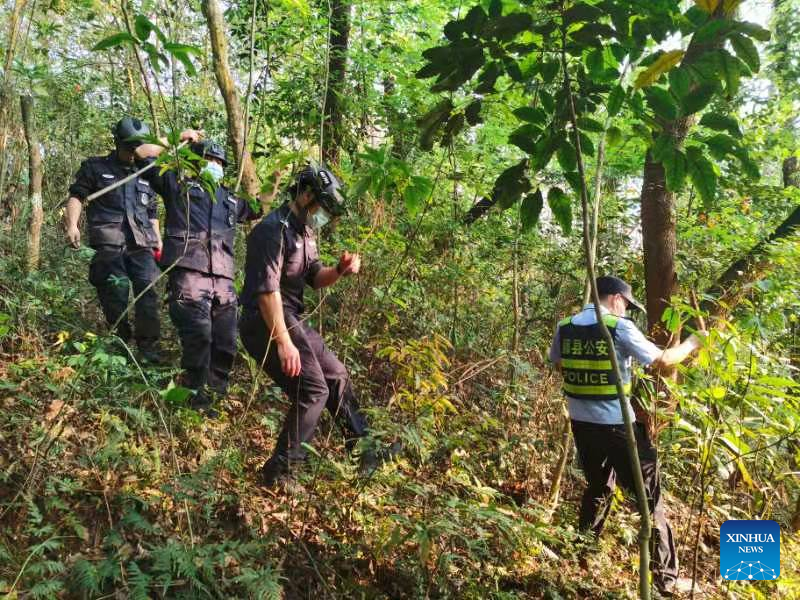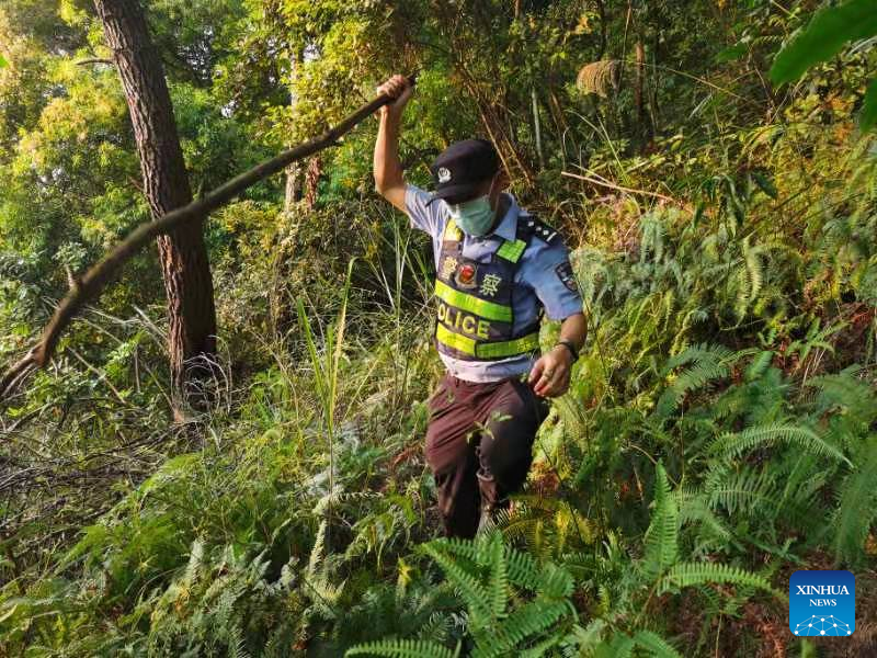 Photo taken with a mobile phone shows a police officer conducting search and rescue work around the plane crash site in Tengxian County, south China's Guangxi Zhuang Autonomous Region, March 21, 2022. A passenger plane with 132 people aboard crashed in south China's Guangxi Zhuang Autonomous Region Monday afternoon, said the regional emergency management department. (Xinhua)