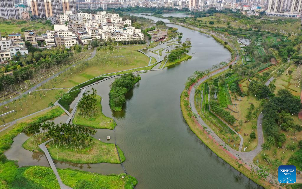 Aerial photo taken on March 19, 2022 shows a view of the Fengxiang wetland park of Meishe River in Haikou, south China's Hainan Province. Dubbed the "mother river" of Haikou, Meishe was recently listed among "the country's 11 most beautiful hometown rivers" by the Ministry of Water Resources.(Xinhua/Guo Cheng)