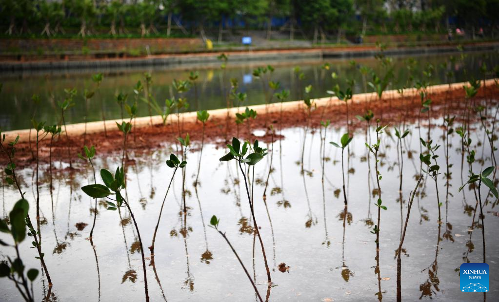Photo taken on July 10, 2017 shows seedlings planted at riverside of Meishe River in Haikou, south China's Hainan Province. Dubbed the "mother river" of Haikou, Meishe was recently listed among "the country's 11 most beautiful hometown rivers" by the Ministry of Water Resources.(Xinhua/Guo Cheng)