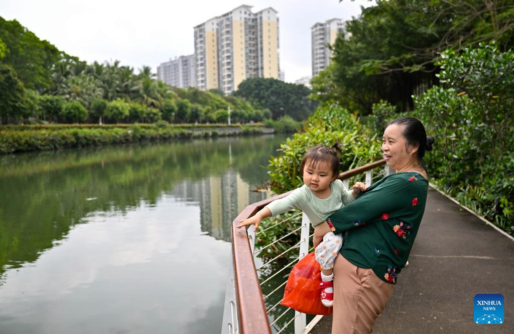 Zhang Shucai, a local citizen, enjoys leisure time with her granddaughter at a footpath at the riverside of Meishe River in Haikou, south China's Hainan Province, March 19, 2022. Dubbed the "mother river" of Haikou, Meishe was recently listed among "the country's 11 most beautiful hometown rivers" by the Ministry of Water Resources.(Xinhua/Guo Cheng)