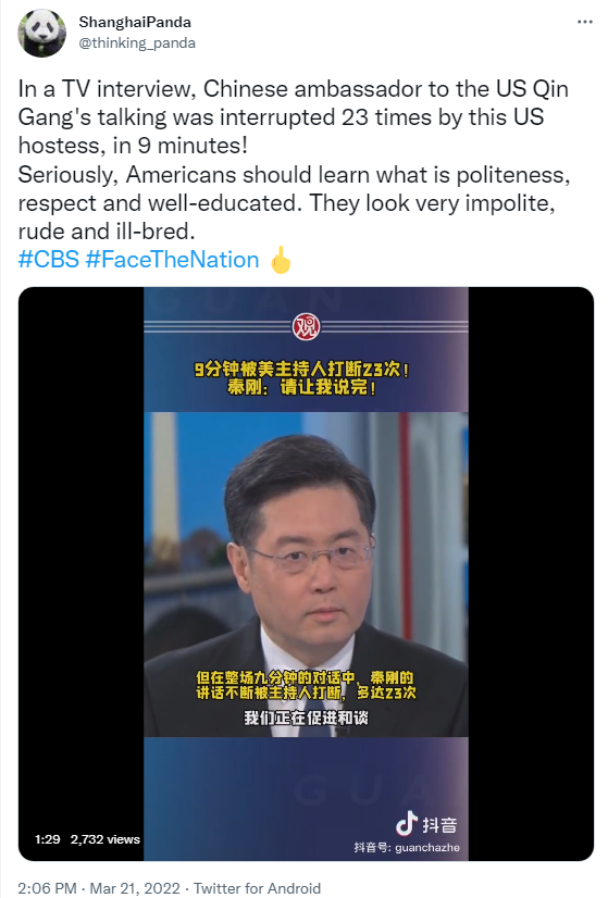 Qin was "interrupted 23 times by this U.S. hostess, in 9 minutes! Seriously, Americans should learn what is politeness, respect and well-educated. They look very impolite, rude and ill-bred," tweeted ShanghaiPanda (@thinking_panda).
