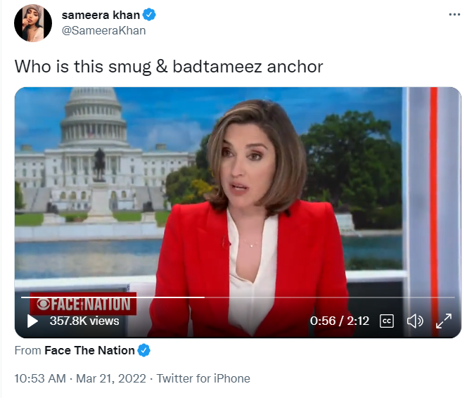 "Who is this smug &badtameez (Urdu word for rude) anchor," questioned New Jersey-based journalist Sameera Khan tagging another clip of the video.