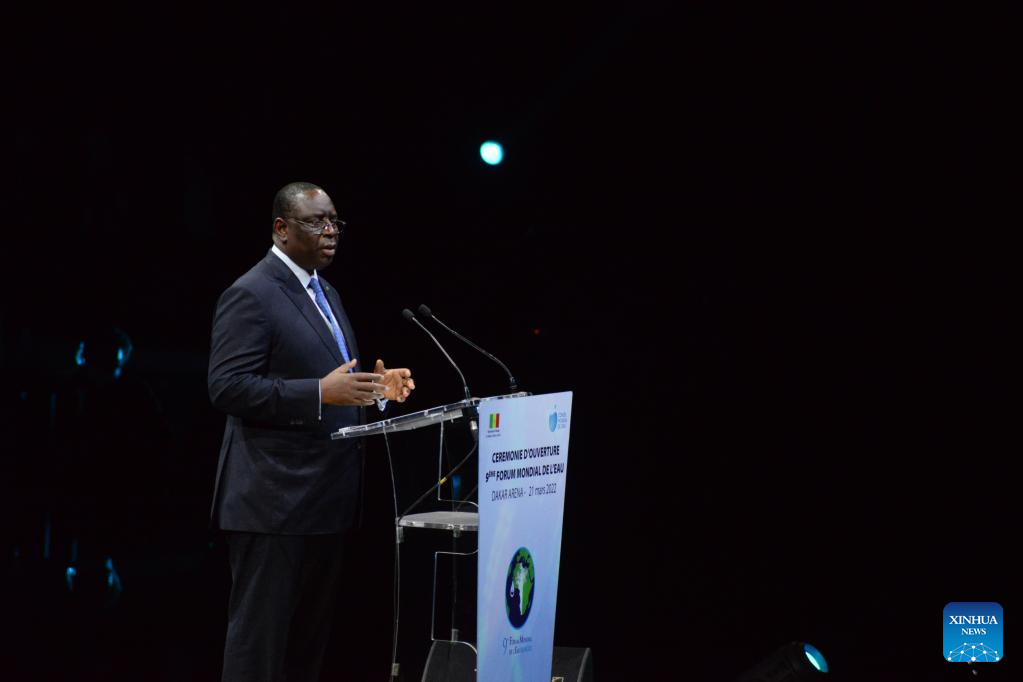 Senegalese President Macky Sall speaks at the opening ceremony of the 9th World Water Forum in Dakar, Senegal, on March 21, 2022. The 9th World Water Forum opened on Monday in Dakar under the theme "Water Security for Peace and Development." (Photo by Dieylani Seydi/Xinhua)