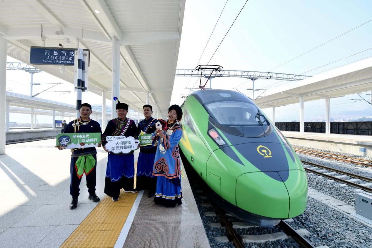 Photo taken on Jan. 10, 2022 at Xichangxi Railway Station in Liangshan Yi autonomous prefecture, southwest China’s Sichuan province, shows train attendants in traditional costumes of ethnic minority groups posing for a photo with Fuxing high-speed train No. D843, which is about to make the first trip from Xichangxi Railway Station to Kunming, capital of southwest China’s Yunnan province. The train trip marked that Liangshan Yi autonomous prefecture officially ushered in the era of high-speed trains. (People’s Daily Online/Hu Zhiqiang)