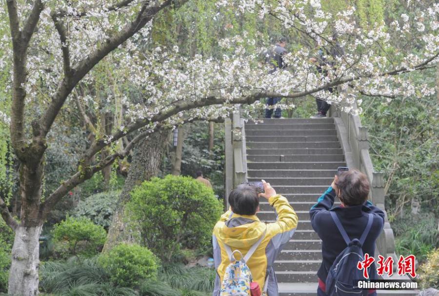 Tourists take photos of cherry blossoms at Su Causeway, West Lake scenic area in Hangzhou, east China's Zhejiang Province, March 20, 2022. Cherry blossoms have entered the blossom season across China. (Photo: China News Service/Wang Gang)