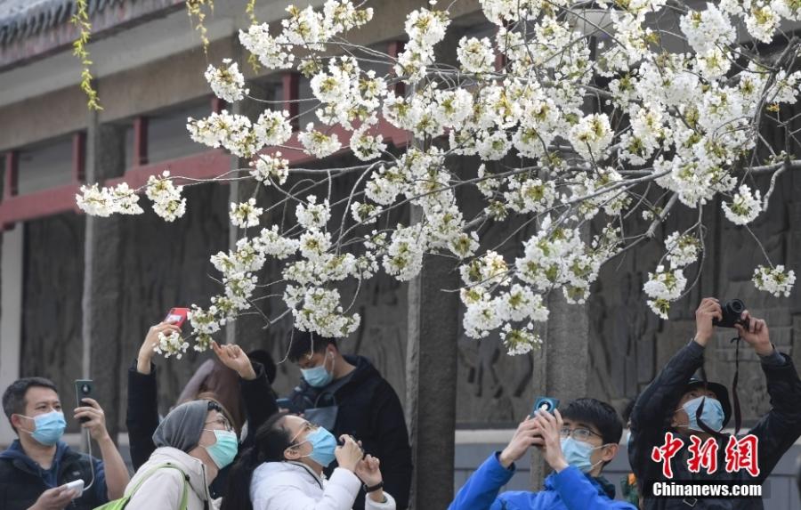 Tourists take photos of cherry blossoms Wulongtan Park of Jinan, east China's Shandong Province, March 20, 2022. Cherry blossoms have entered the blossom season across China. (Photo: China News Service/Zhang Yong)