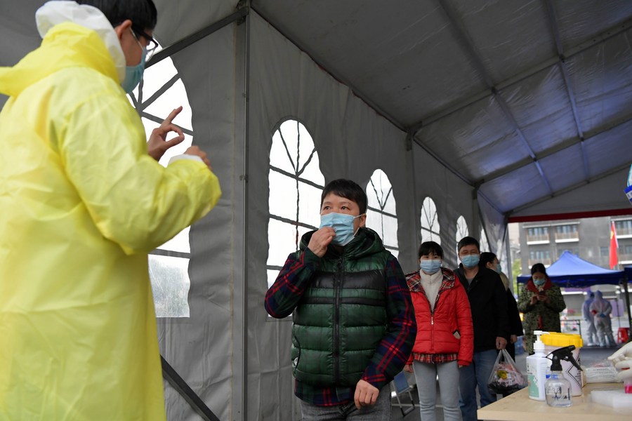 Li Huanqiu (1st L) uses sign language to guide hearing-impaired residents during a COVID-19 nucleic acid test at a testing site in Nanchang, east China's Jiangxi Province, March 21, 2022. (Xinhua/Peng Zhaozhi)