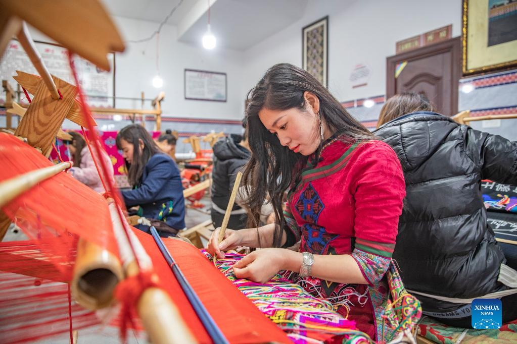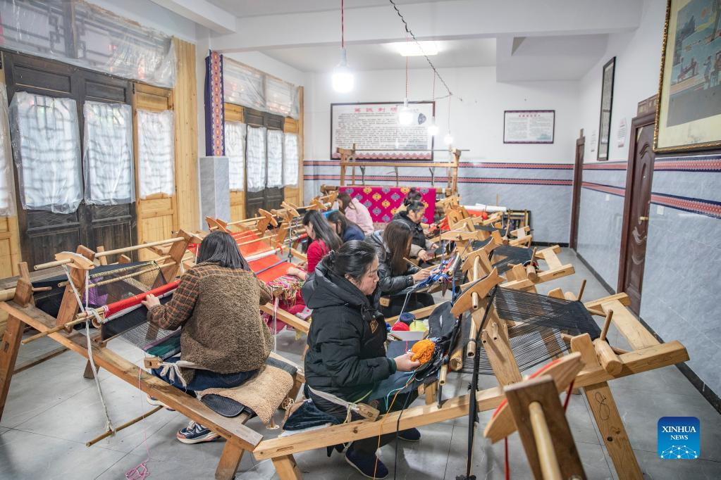 Women make products of Xilankapu, which is a kind of Tujia brocade, at a studio in Xiaonanhai Town of Qianjiang District in southwest China's Chongqing, March 22, 2022. Xilankapu, also known as "knitting Floral Bedclothes," was listed as national intangible cultural heritage in 2006. (Xinhua/Huang Wei)
