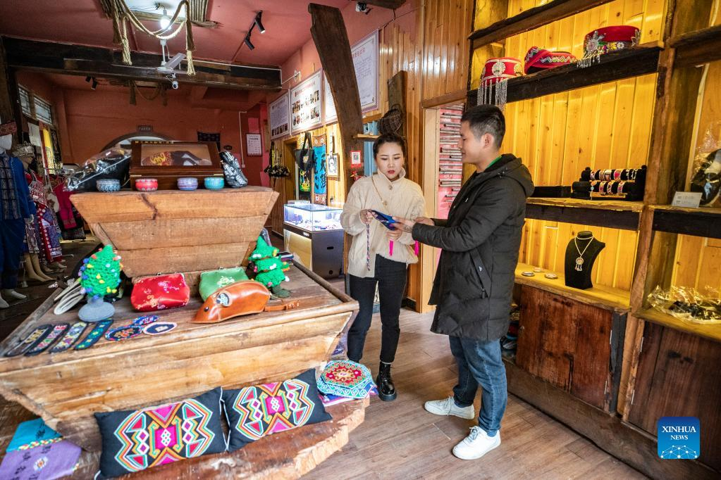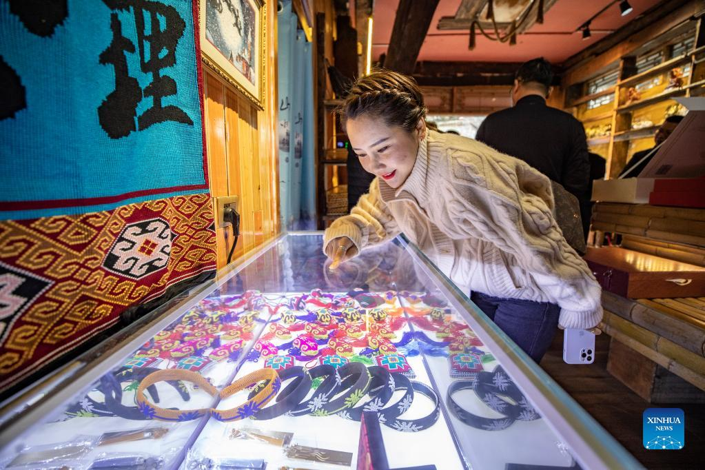 A visitor selects products of Xilankapu, which is a kind of Tujia brocade, displayed at Xiaonanhai Town of Qianjiang District in southwest China's Chongqing, March 22, 2022. Xilankapu, also known as "knitting Floral Bedclothes," was listed as national intangible cultural heritage in 2006. (Xinhua/Huang Wei)