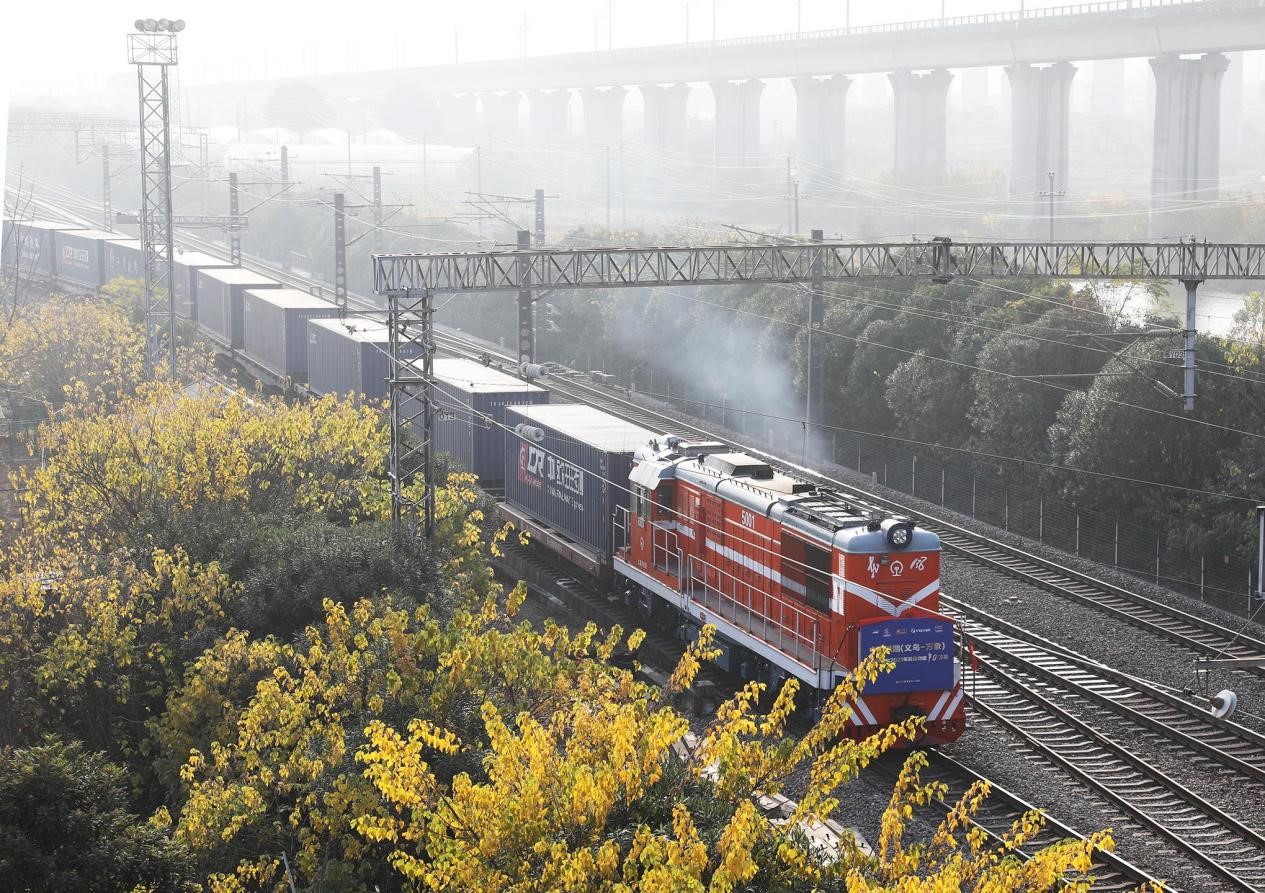 A freight train of the China-Laos Railway departs from Yiwu, east China's Zhejiang province for Vientiane, carrying 70 standard containers of goods, Dec. 13, 2021. (People's Daily Online/Gong Xianming)