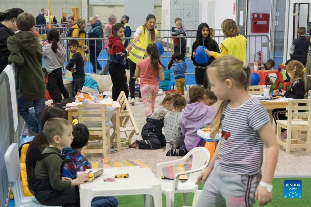 Volunteers take care of children from Ukraine at a new transit shelter opened by the Defense Committee of Budapest at the Budapest Olympic Center in Budapest, Hungary on March 21, 2022. (Photo by Attila Volgyi/Xinhua)