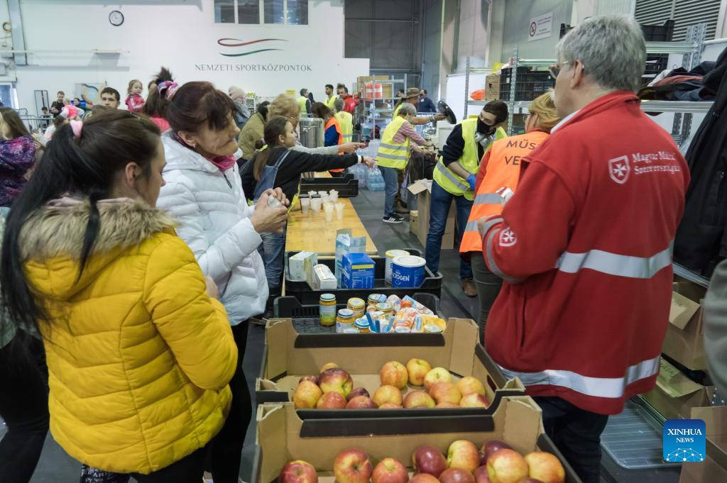Volunteers help people from Ukraine at a new transit shelter opened by the Defense Committee of Budapest at the Budapest Olympic Center in Budapest, Hungary on March 21, 2022. (Photo by Attila Volgyi/Xinhua)