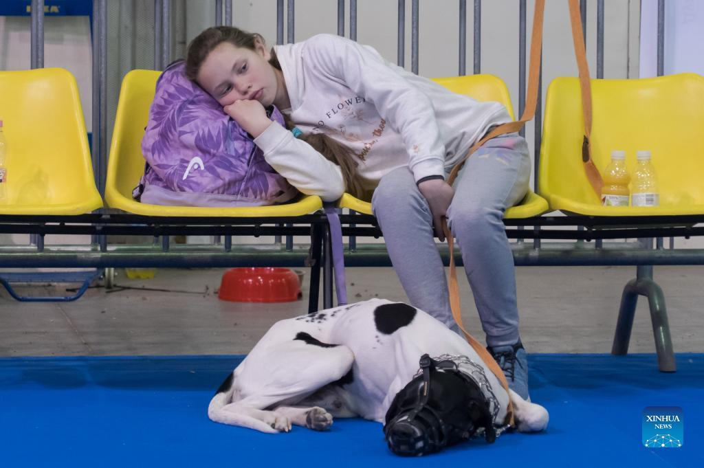 A girl from Ukraine takes a rest with her dog at a new transit shelter opened by the Defense Committee of Budapest at the Budapest Olympic Center in Budapest, Hungary on March 21, 2022. (Photo by Attila Volgyi/Xinhua)