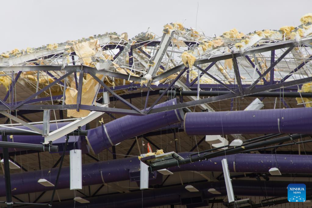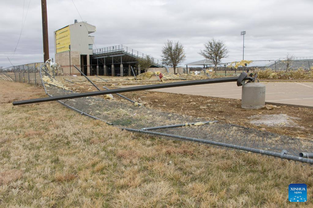 Photo taken on March 22, 2022 shows a school building damaged by a tornado in Jacksboro, northern Texas, the United States. Many people were injured after several tornadoes on Monday ripped through parts of the south-central U.S. states of Texas and Oklahoma, officials said. (Photo by Dan Tian/Xinhua)