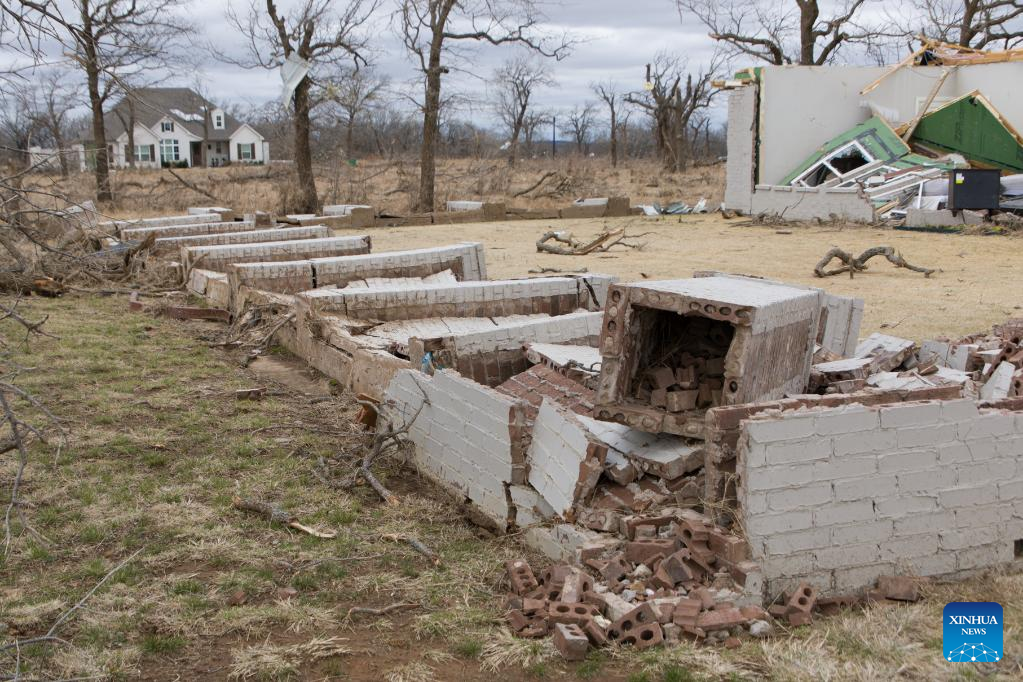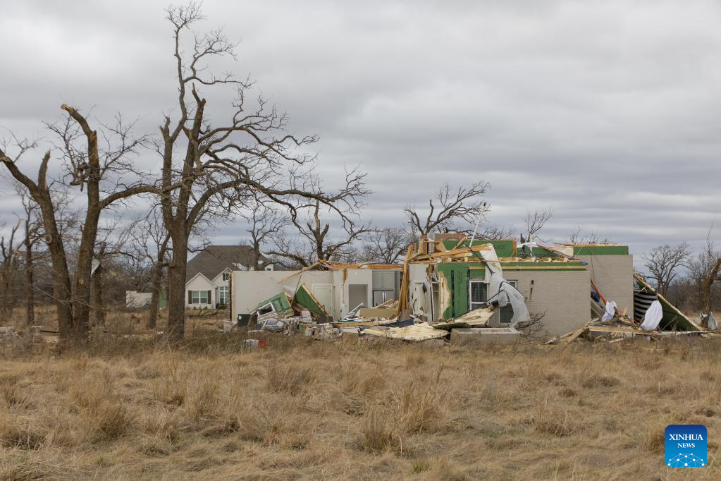 Photo taken on March 22, 2022 shows a house damaged by a tornado in Jacksboro, northern Texas, the United States. Many people were injured after several tornadoes on Monday ripped through parts of the south-central U.S. states of Texas and Oklahoma, officials said. (Photo by Dan Tian/Xinhua)