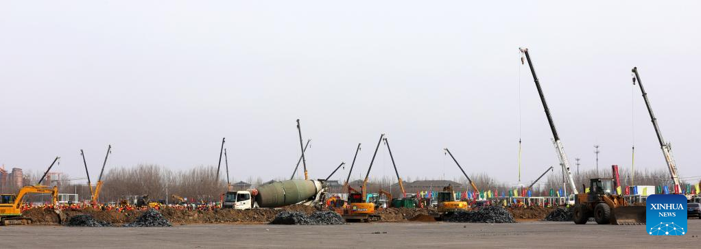Photo taken on March 22, 2022 shows the construction site of the health station at Shenyang International Exhibition Center in Shenyang, northeast China's Liaoning Province. The temporary hospital and health station at Shenyang International Exhibition Center started construction on March 20, 2022. (Xinhua/Yang Qing)