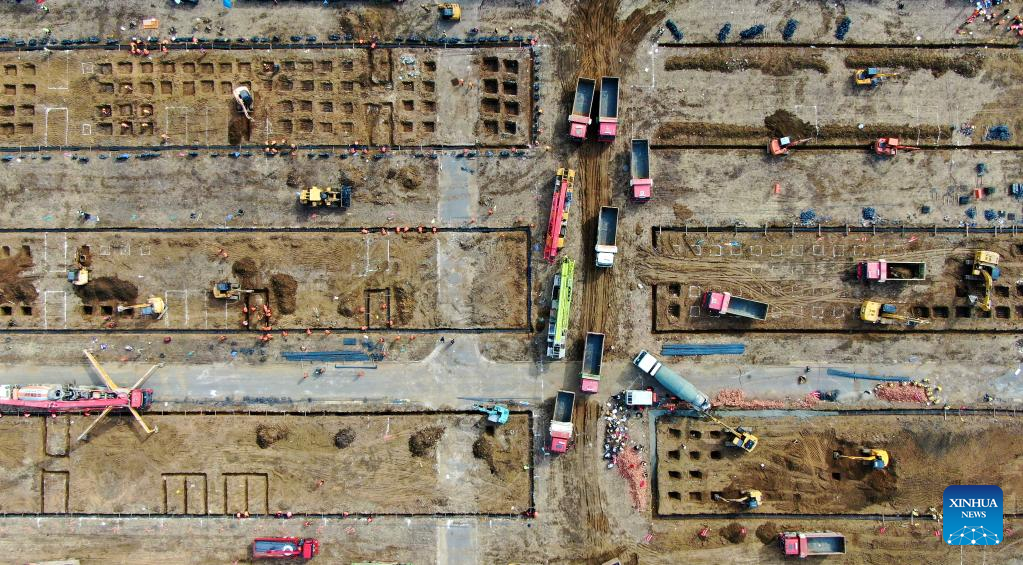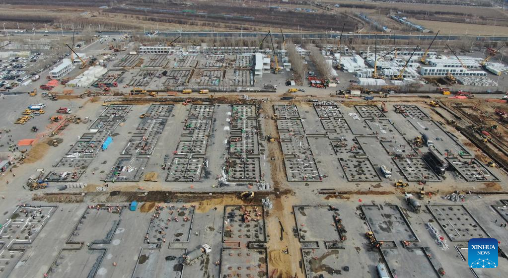 Aerial photo taken on March 22, 2022 shows the construction site of the health station at Shenyang International Exhibition Center in Shenyang, northeast China's Liaoning Province. The temporary hospital and health station at Shenyang International Exhibition Center started construction on March 20, 2022. (Xinhua/Yang Qing)