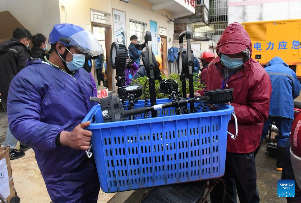 Local residents prepare to transfer lighting equipment to rescue area on a motorcycle in Molang Village of Tengxian County, south China's Guangxi Zhuang Autonomous Region, March 23, 2022. A passenger plane carrying 132 people on Monday crashed into a mountainous area near Molang Village in Tengxian County. More than 2,000 people have joined the rescue operation at the site. (Xinhua/Lu Boan)