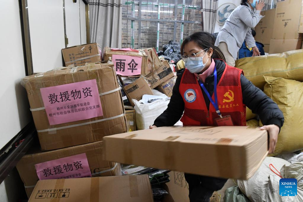 Staff carry supplies in Molang Village of Tengxian County, south China's Guangxi Zhuang Autonomous Region, March 23, 2022. A passenger plane carrying 132 people on Monday crashed into a mountainous area near Molang Village in Tengxian County. More than 2,000 people have joined the rescue operation at the site. (Xinhua/Lu Boan)