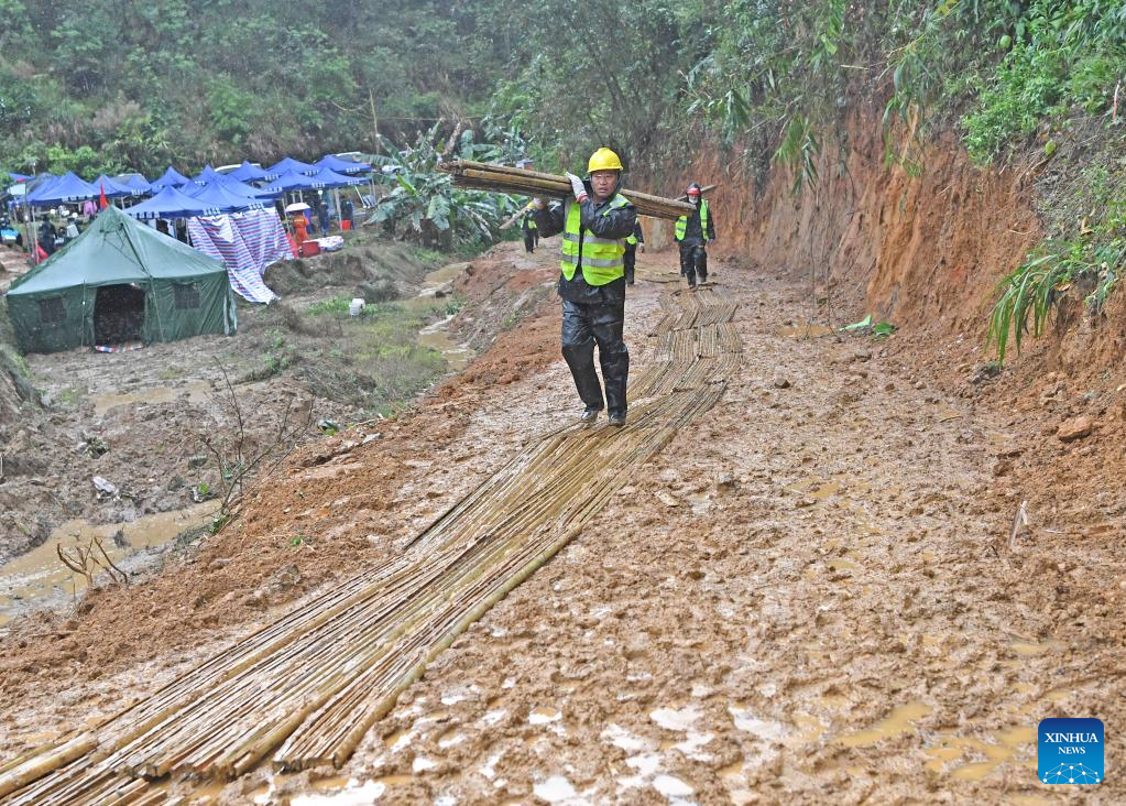 A road leading to the core site of the accident has been built and weaved bamboo has been laid along the road to reduce the impact of the rain. (Xinhua/Zhou Hua)