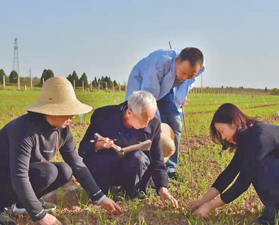 Zhao Yu (2nd L) checks on the growth status of planted wheat. (Photo/Shi Liangqi)