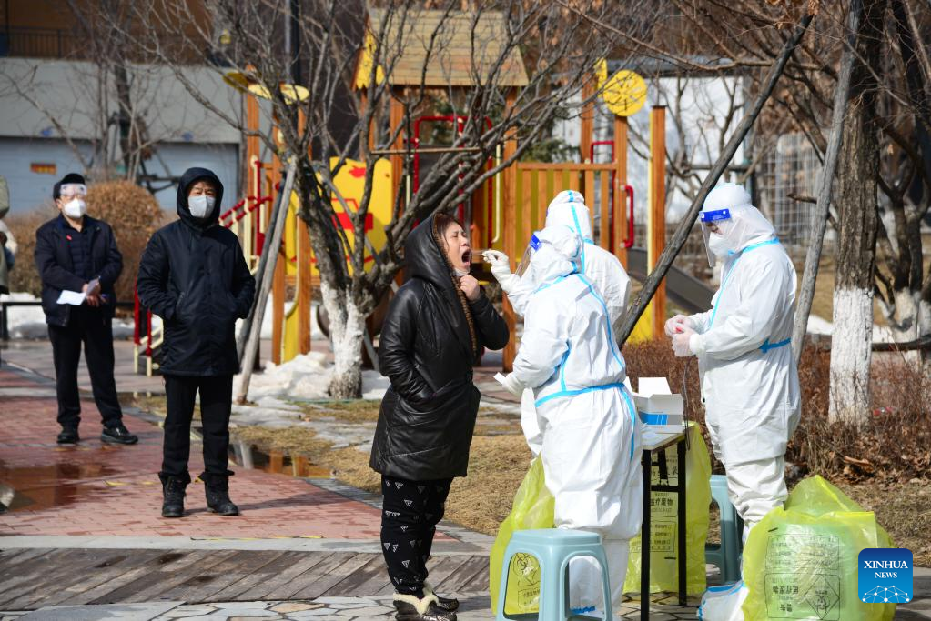 A medical worker takes a swab sample from a resident for nucleic acid test at a COVID-19 testing site in Changchun, northeast China's Jilin Province, March 24, 2022. (Photo by Wu Ran/Xinhua)