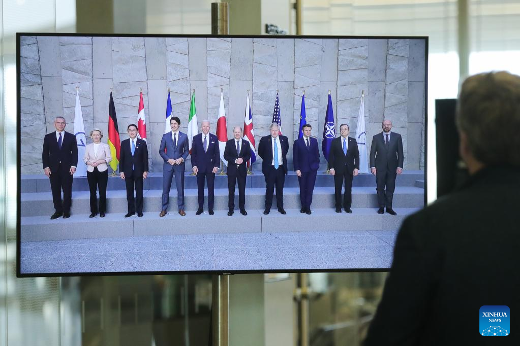 A man watches a screen displaying U.S. President Joe Biden (4th R), President of the European Commission Ursula von der Leyen (3rd R), Canadian Prime Minister Justin Trudeau (2nd R) and German Chancellor Olaf Scholz (1st R) attending a photo session during a meeting of G7 Leaders at the NATO headquarters in Brussels, Belgium, March 24, 2022. (Xinhua/Zheng Huansong)