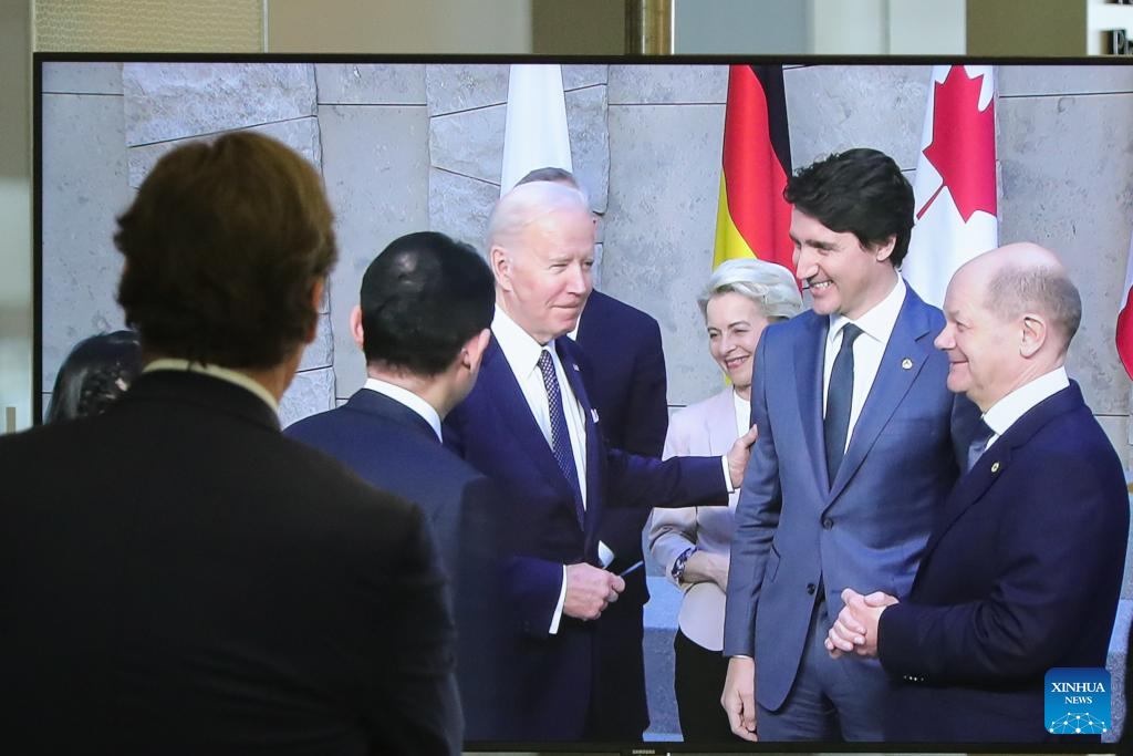 A man watches a screen displaying U.S. President Joe Biden (R) and Canadian Prime Minister Justin Trudeau attending a group photo session during a meeting of G7 Leaders at the NATO headquarters in Brussels, Belgium, March 24, 2022. (Xinhua/Zheng Huansong)