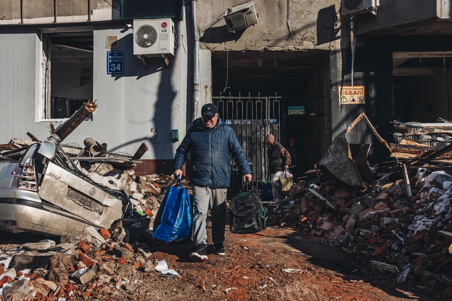 A man takes his belongings from his house in Kharkov, Ukraine, March 13, 2022. (Photo by Diego Herrera/Xinhua)
