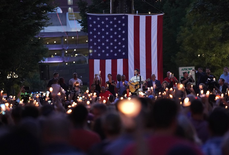 People attend a vigil to mourn the victims of a mass shooting in Dayton of Ohio, the United States, on Aug. 4, 2019. (Xinhua/Liu Jie)