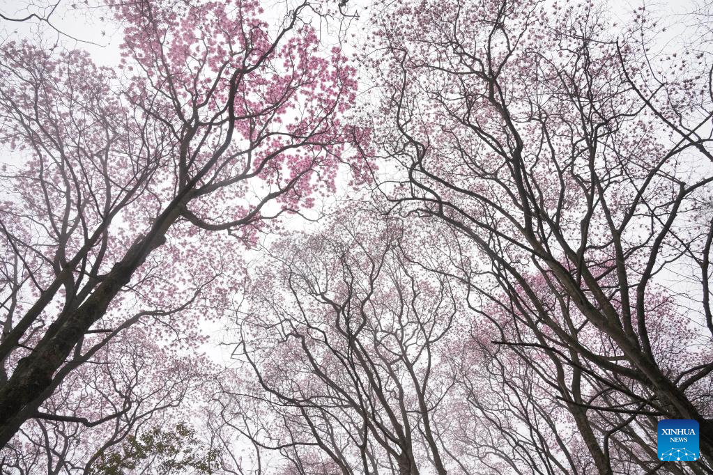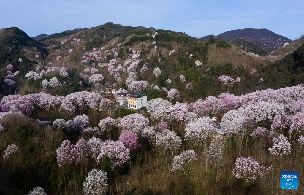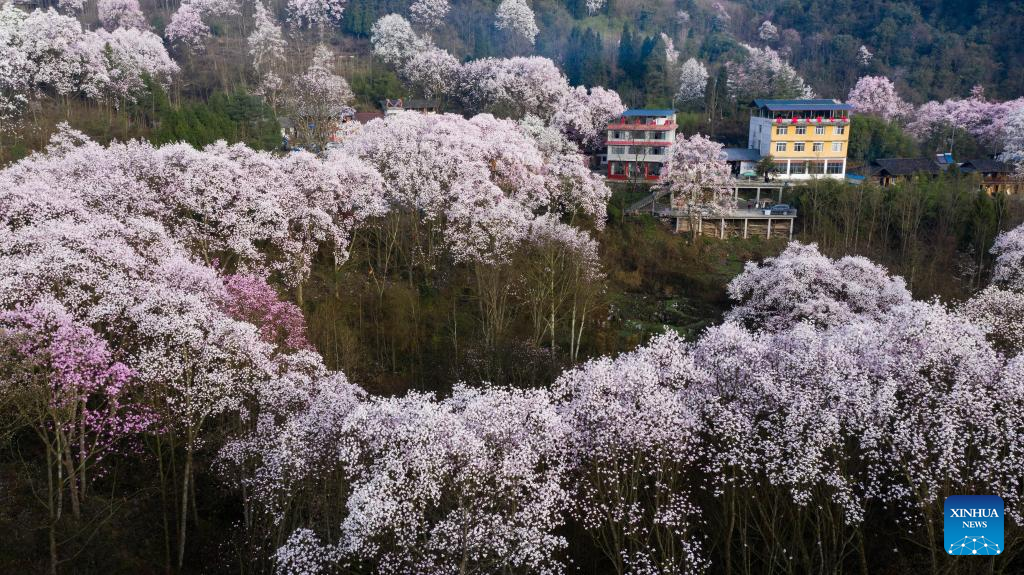 Aerial photo taken on March 23, 2022 shows magnolia flowers in full bloom in Daitianshan Village of Jiangyou, southwest China's Sichuan Province. (Xinhua/Jiang Hongjing)