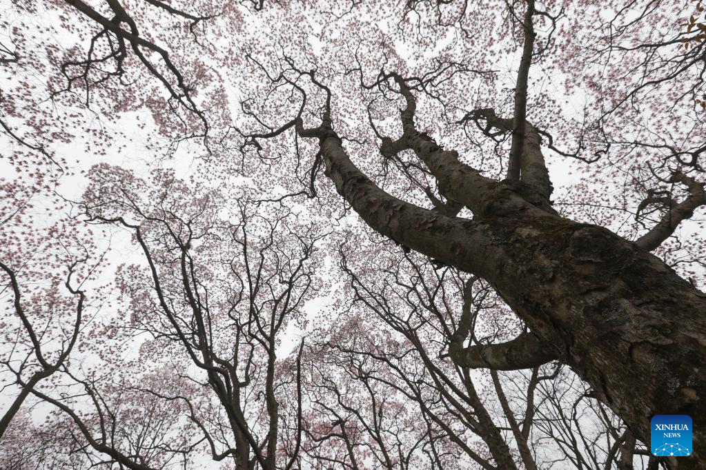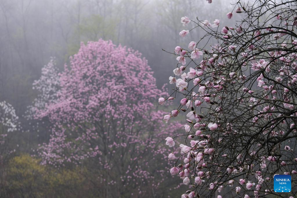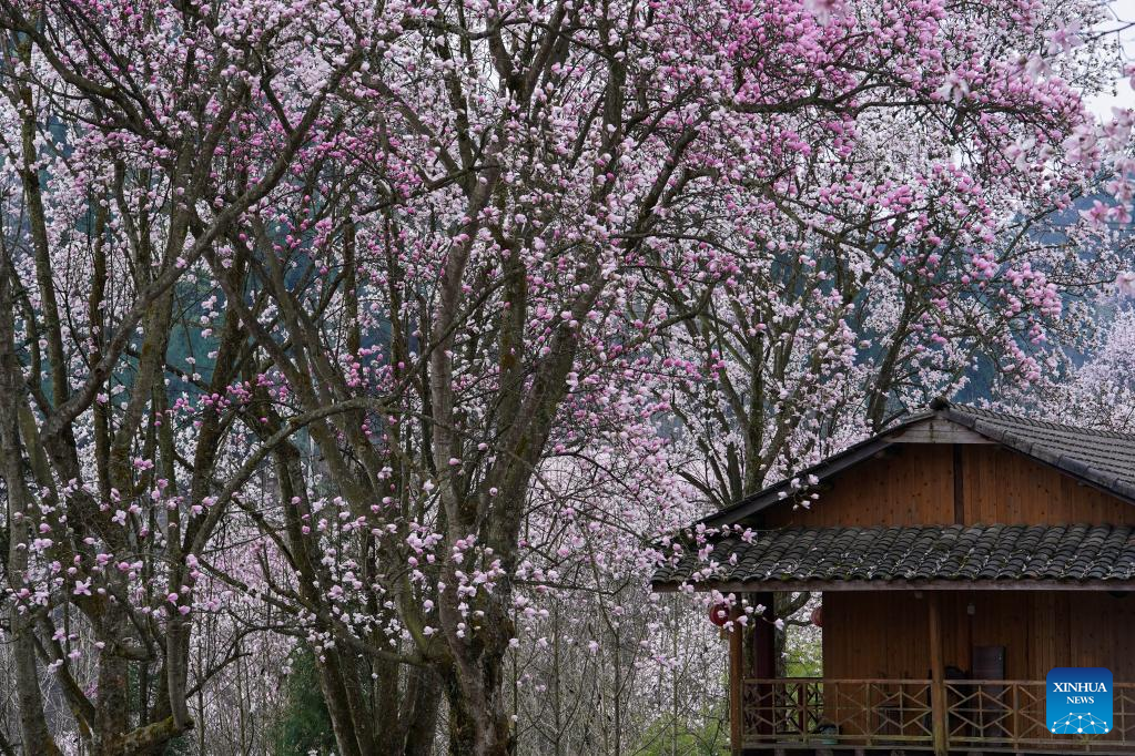 Photo taken on March 23, 2022 shows magnolia flowers in full bloom in Daitianshan Village of Jiangyou, southwest China's Sichuan Province. (Xinhua/Jiang Hongjing)