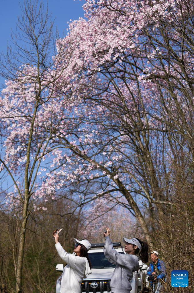 People take photos of magnolia flowers in Daitianshan Village of Jiangyou, southwest China's Sichuan Province, March 23, 2022. (Xinhua/Jiang Hongjing)