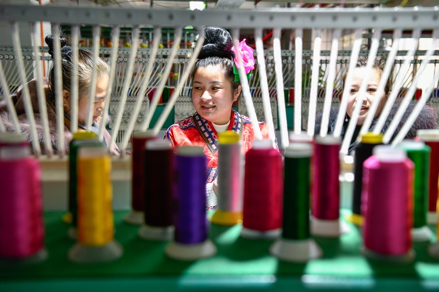 Yang Mei (C) introduces materials for ethnic clothing to a customer (L) at her garment factory in Kaili, southwest China's Guizhou Province, Jan. 30, 2022. (Xinhua/Yang Wenbin)