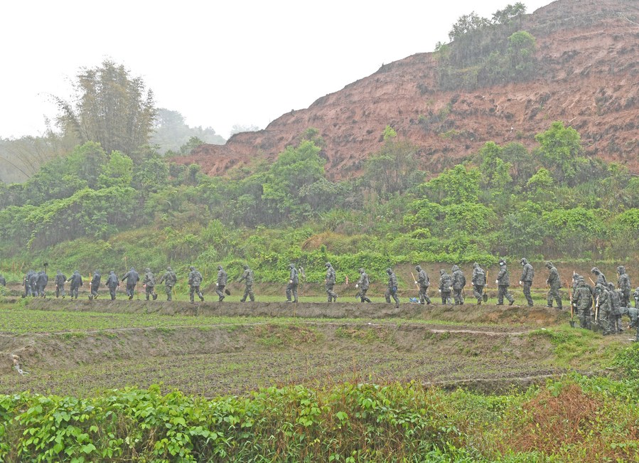 Rescuers are on the way to search for the other black box in the area around the plane crash site in Tengxian County, south China's Guangxi Zhuang Autonomous Region, March 24, 2022. (Xinhua/Lu Boan)