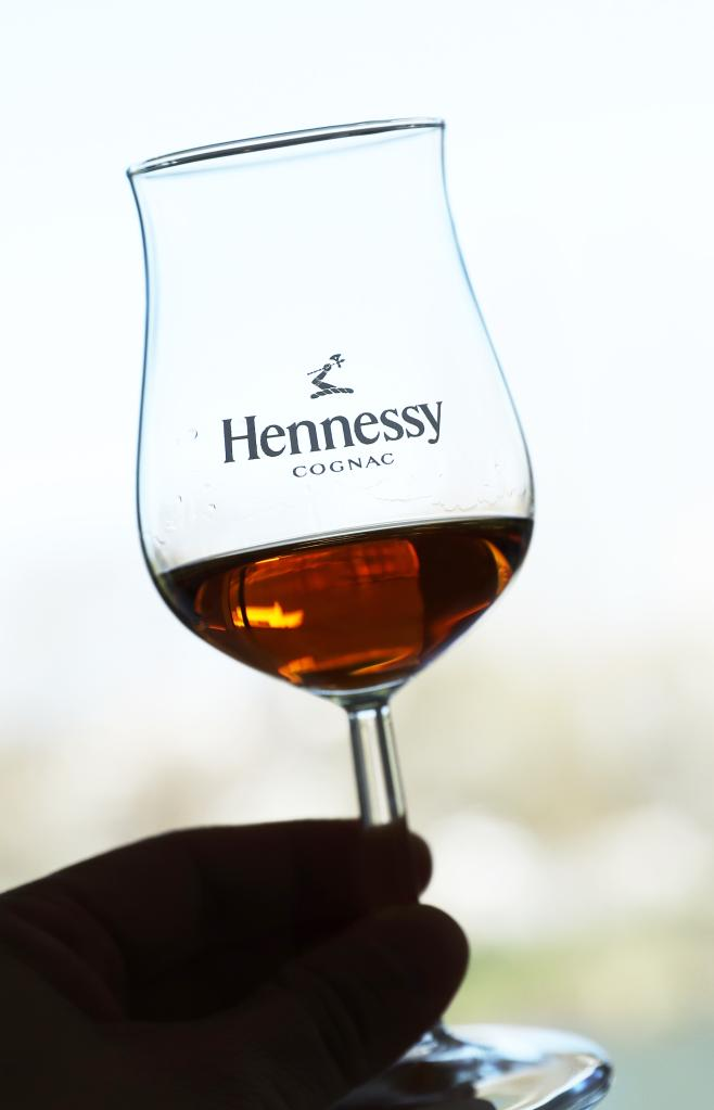 A glass of Hennessy cognac is pictured at the Hennessy house in Cognac, southwestern France, March 22, 2022. Cognac/eau-de-vie de cognac/eau-de-vie des charentes is listed in the China-EU agreement on geographical indications. (Xinhua/Gao Jing)